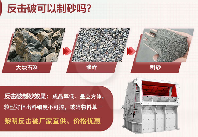 反擊破是可以制砂的,但是根據(jù)目前的生產(chǎn)實驗得到的數(shù)據(jù),基本可以達(dá)到制砂的效果,反擊破的制砂率大概在30%左右。畢竟不是專業(yè)制砂設(shè)備,如果對機制砂成品要求比較高的話,建議后續(xù)還是再加一臺專業(yè)制砂設(shè)備。